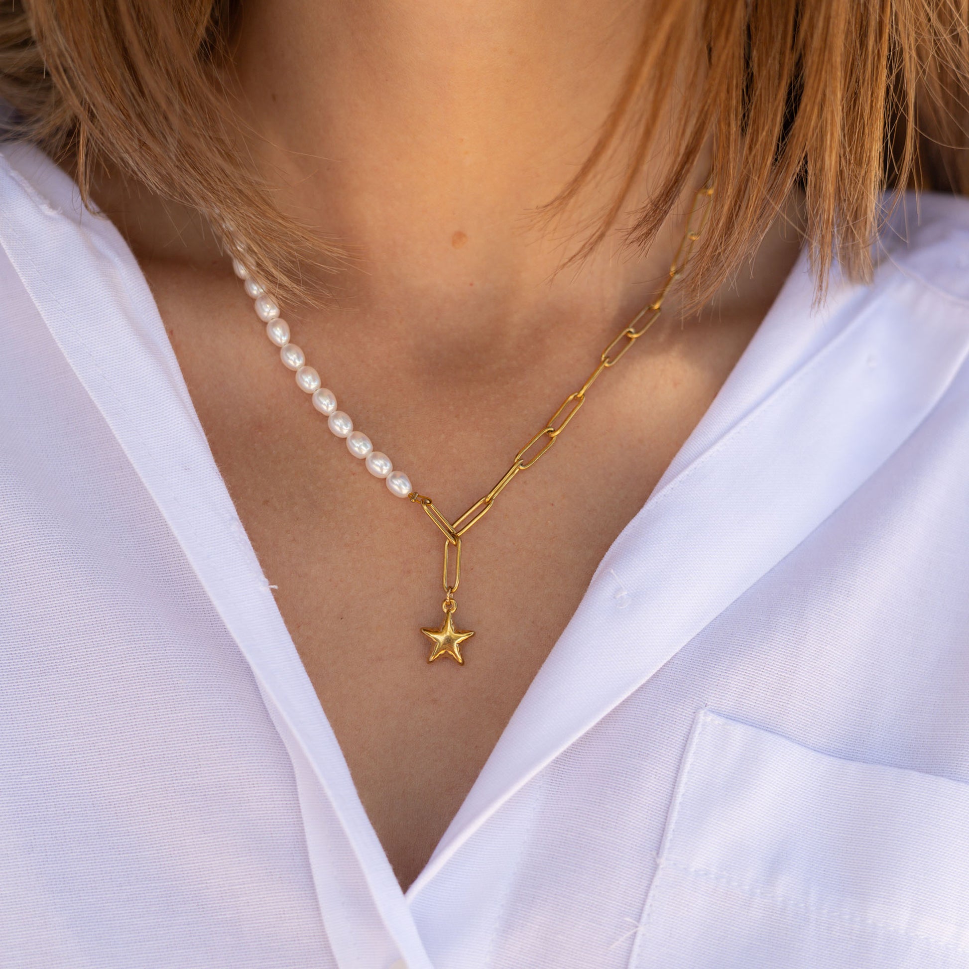 Colier Glitterati cu perle naturale de cultură, placat cu aur galben de 18K, placare prin procedeu PVD**
